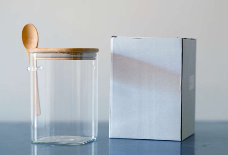 Borosil Jar Sq Med + Wood Lid and Spoon